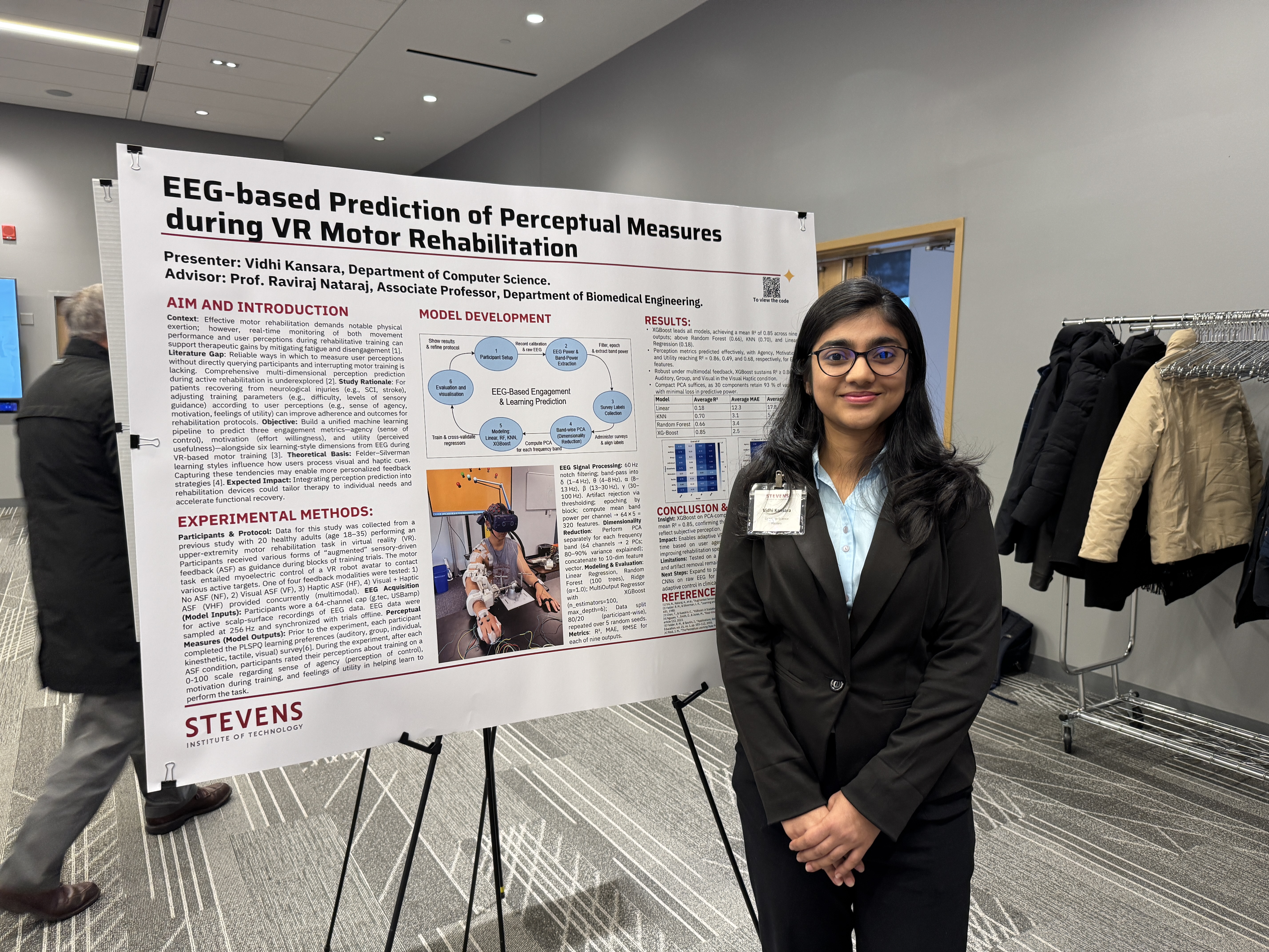 On November 12th, 2025, Masters student Vidhi Kansara presented her work title "EEG-based Prediction of Perceptual Measures during VR Motor Rehabilitation" at the SIAI Fellows Poster Presentation Event at Stevens Institute of Technology.